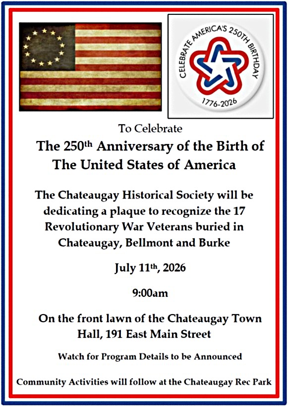 The Historical Society is planning and preparing for our dedication ceremony to be held on July 11 at 9:00am on the front steps of the Town Hall. We will be dedicating a plaque in honor of the 17 men who fought in the American Revolution and are buried in Chateaugay, Burke and Bellmont.