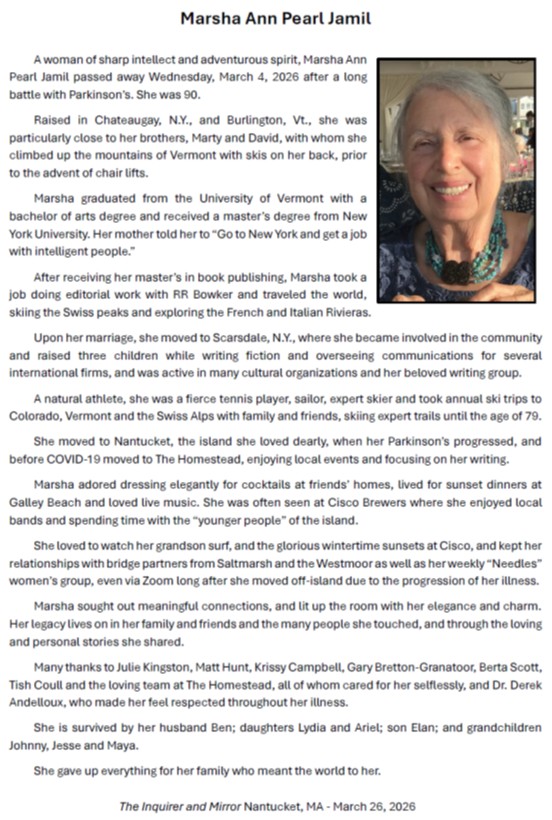 We have just learned of the passing of Marsha Pearl Jamil. If you remember Pearl's Department Store on East Main St., Marsha was Mrs. Pearl's middle child (she had an older brother, David, and younger brother, Marty). She graduated from CCS with the Class of 1952. She was a long-time member of the Historical Society, and one of our biggest boosters. She wrote articles for the newsletter and was a great source of information for the article I wrote on the Jewish families in Chateaugay, back in 2021. I spoke with her several times over the recent years.