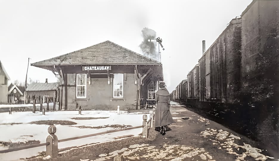 A view of the Chateaugay Passenger Depot from 95 years ago. A woman walks past a stopped train in 1931. The smoke from the engine can be seen in the distance over the roof of the depot building. Both freight and passenger trains came through Chateaugay several times each day.